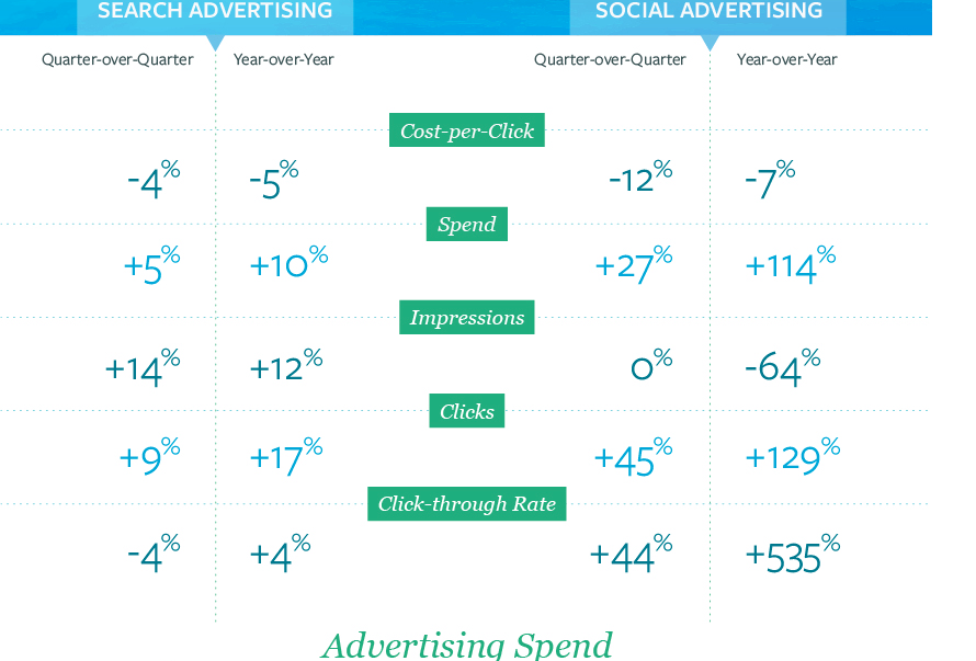 Ces données sont présentées dans une nouvelle infographie – Kenshoo Marketing Numérique Snapshot : Q2 2015 – dévoilée aujourd’hui ( ci dessus un extrait). Celle-ci propose les indicateurs clés du référencement payant et de la publicité sur les réseaux sociaux, à partir de l’étude de 550 milliards d’impressions, 9,5 milliards de clics et 5.5 milliards (USD) de dépenses gérés via Kenshoo Infinity Suite.