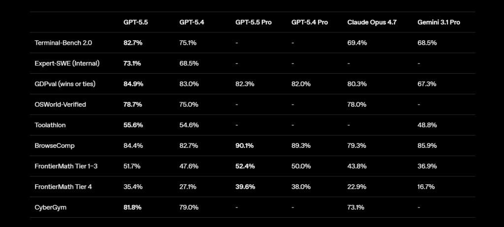 Côté évaluations, le retour d’OpenAI en tête des classements est spectaculaire. Selon les chiffres publiés par OpenAI, GPT-5.5 affiche l’état de l’art sur quatorze tests tiers, contre quatre seulement pour Opus 4.7 et deux pour Gemini 3.1 Pro.