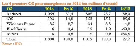 Les systèmes d’exploitation Android et iOS écrasent tout sur leur passage. Sur 2014, ils totalisent plus de 96 % ventes de smartphones et ne laissent que des miettes à leur deux concurrents Microsoft avec Windows Phone qui reste en deçà des 3 % et Blackberry qui disparait progressivement des écrans radar avec 0,4 %.