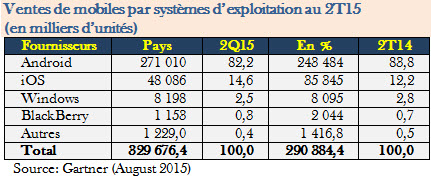 Il s’est vendu 330 millions de smartphones au 2e trimestre 2015, en progression de 13,5 par rapport à la même période de l’année passée. Il s’agit là d’un ralentissement qui devrait se poursuivre car les marchés sont en cours de saturation mais il reste toujours des marges de progression dans la mesure où il s’est vendu 115 millions de mobiles qui ne demandent qu’à être transformés en smartphones.