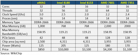 Depuis que Fairchild Semiconductor a intégré un transistor sur une plaquette de silicium, l’objectif est d’augmenter la densité des transistors afin d’augmenter la puissance et de diminuer la consommation énergétique. Fort de cette stratégie globale, ARM a donc décidé de s’attaquer au data center et donc à Intel et à son quasi-monopole. Ampere qui est un des concepteurs de processeurs ARM a publié récemment une comparaison avantageuse de son processeur eMAG avec les processeurs Intel et AMD. Pour la petite histoire, Ampere a été créé en 2017 avec des anciens d’Intel et d’AMD.
