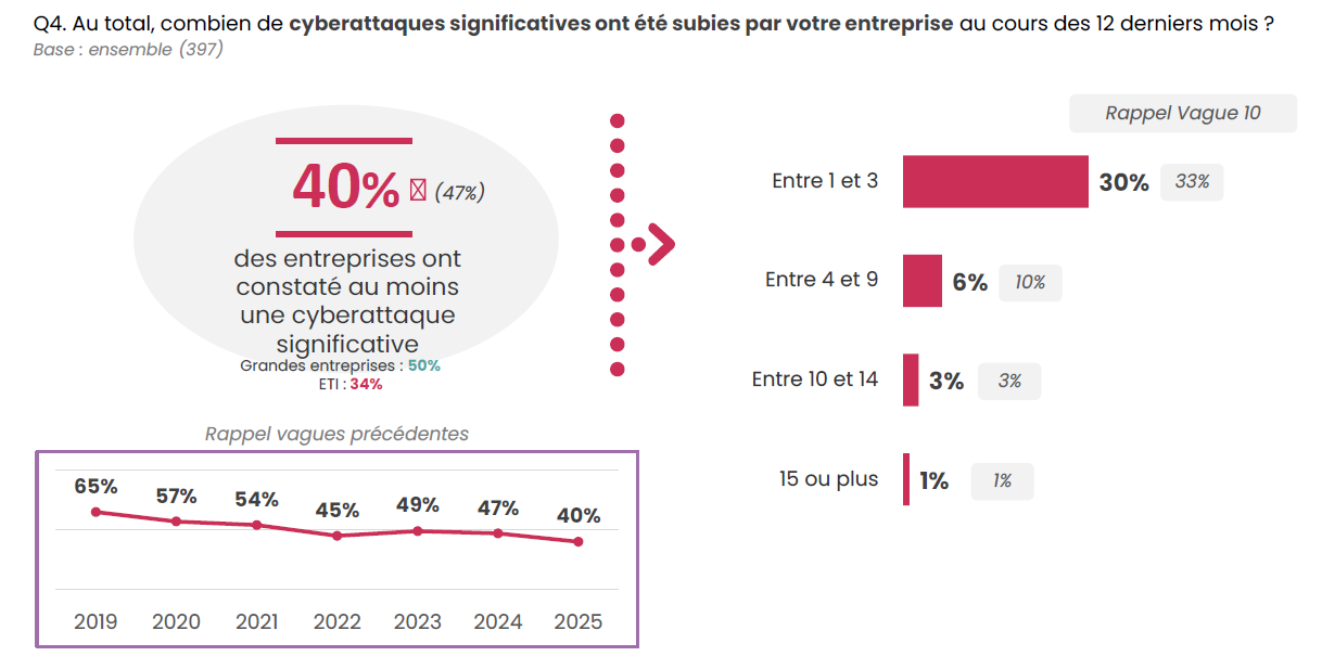 Comme les précédentes années, le CESIN note une baisse qui se poursuit des attaques réussies. Elles ne sont plus que 40% selon ce 11è baromètre. Elles étaient encore plus de 65% il y a six ans.