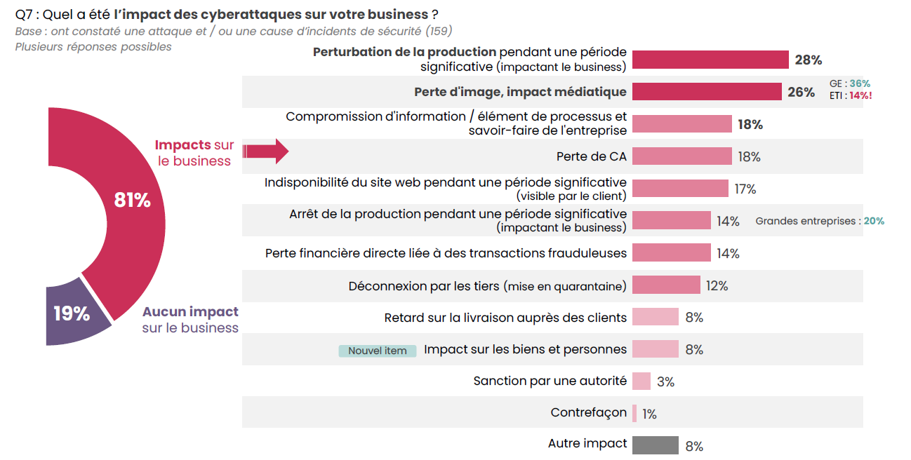 Dans le 11ème Baromètre de la cybersécurité des entreprises (11e vague) du CESIN, publié cette semaine, 81% des organisations ayant subi une cyberattaque « significative » déclarent un impact sur leur activité, d’abord via des perturbations de production et des pertes d’image.