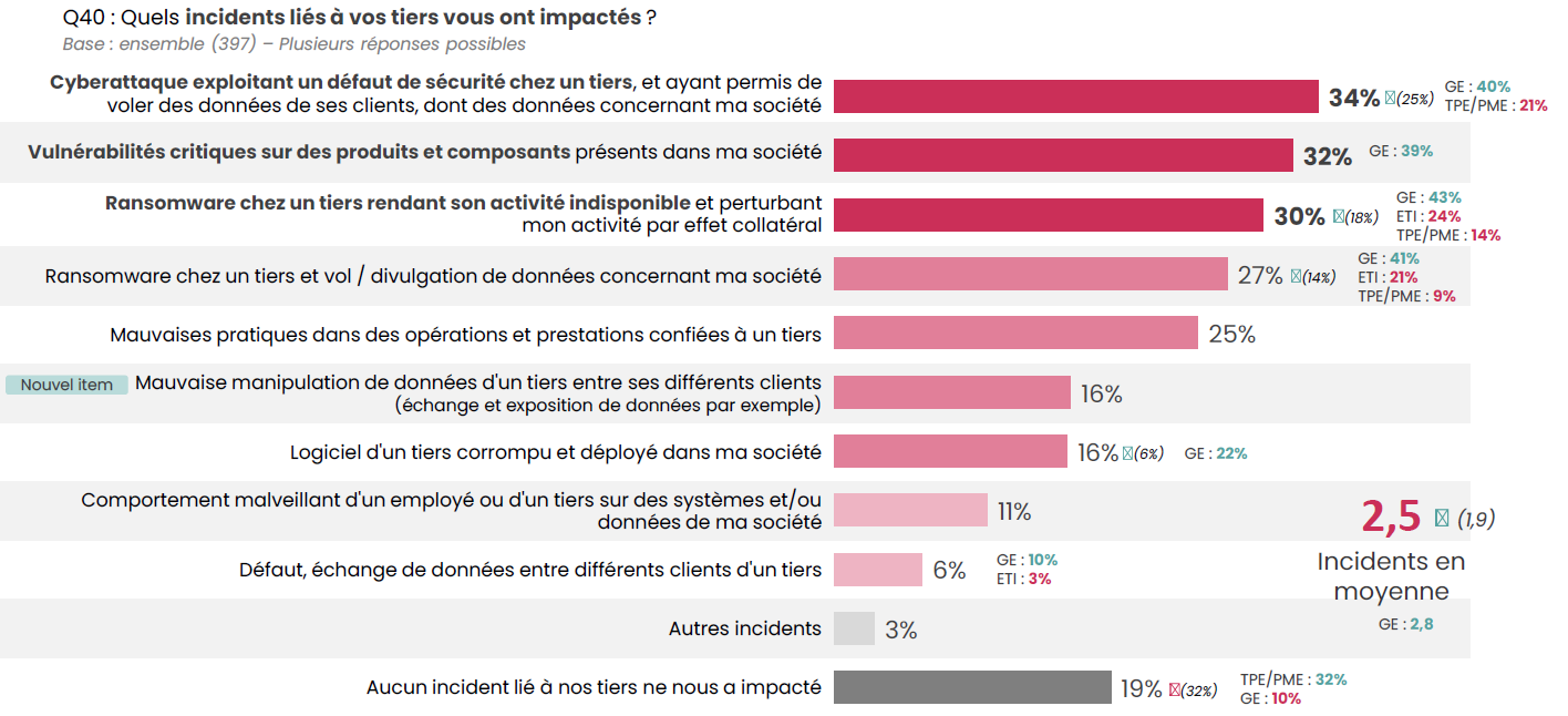 Les attaques à la supply chain demeurent l’un des grands sujets d’inquiétude. Un tiers des entreprises estime que plus de 50% de leurs incidents de cybersécurité sont dus à des tiers.