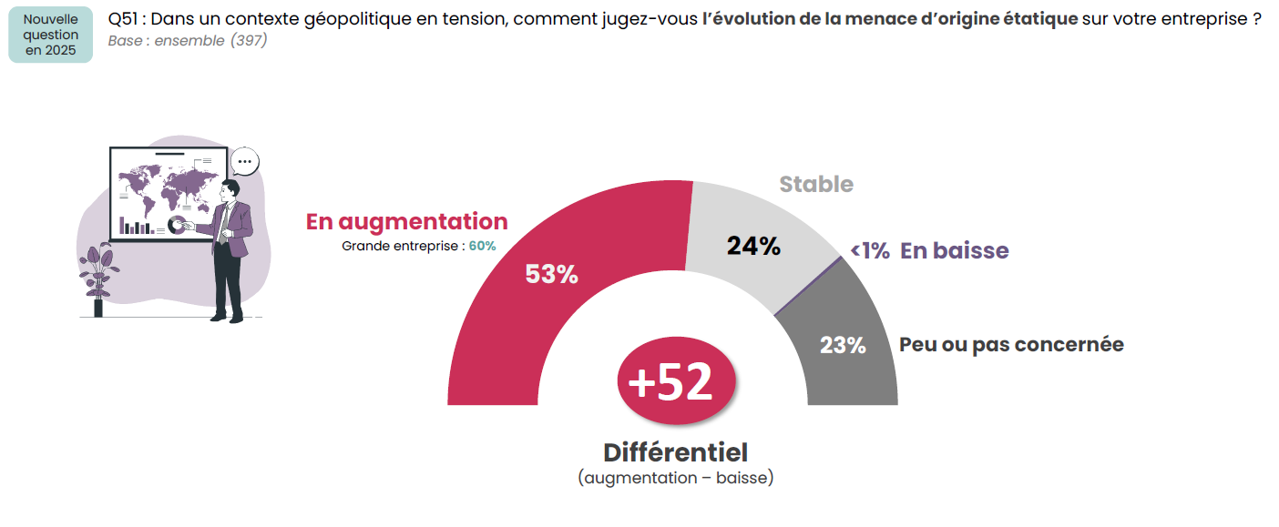 Parallèlement un autre chiffre claque : 53 % des répondants estiment que la menace d’origine étatique est en augmentation. C’est sans aucun doute l’un des enseignements les plus marquants de cette 11ème édition : le cyberespionnage est perçu comme un risque élevé par 40 % des entreprises, quelle que soit leur taille. Cette prise de conscience se traduit par un intérêt croissant pour la souveraineté numérique : 63 % des répondants se disent concernés par les enjeux de cloud de confiance, en hausse de 11 points.