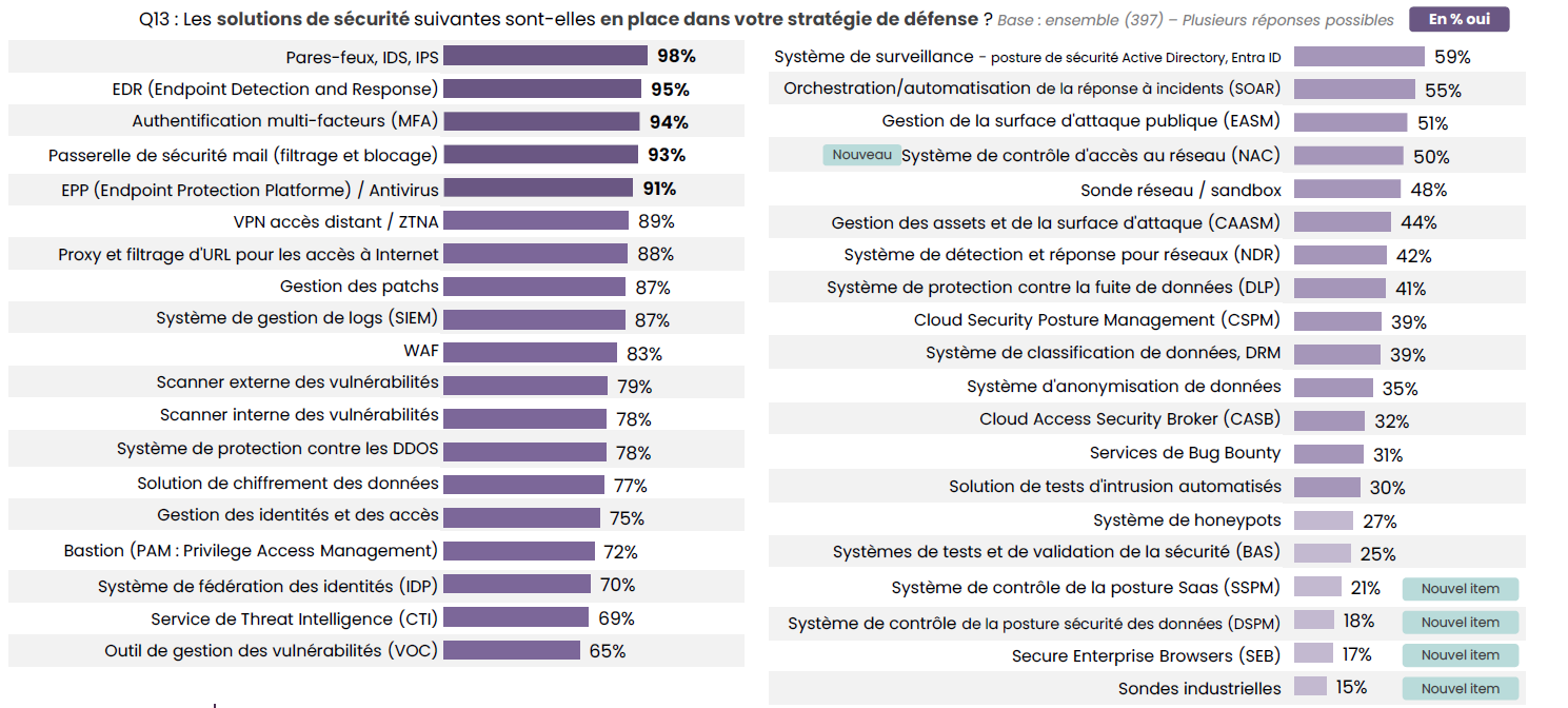 Le trio défensif de base atteint des niveaux de déploiement quasi universels : pare-feu (98 %), EDR (95 %), authentification multifacteur (94 %). Les passerelles de sécurité email (93%), les solutions EPP (91%) et les solutions ZTNA (89%) suivent juste derrière et conservent une forte popularité. D’autres ont encore du mal à percer, à l’instar des outils de gestion de posture (CSPM pour le Cloud, SSPM pour le SaaS, DSPM pour la data), les solutions CASB, les systèmes d’anonymisation (malgré les 10 ans du RGPD) ou encore les services de bug bounty et les solutions de tests d’intrusion automatisés.