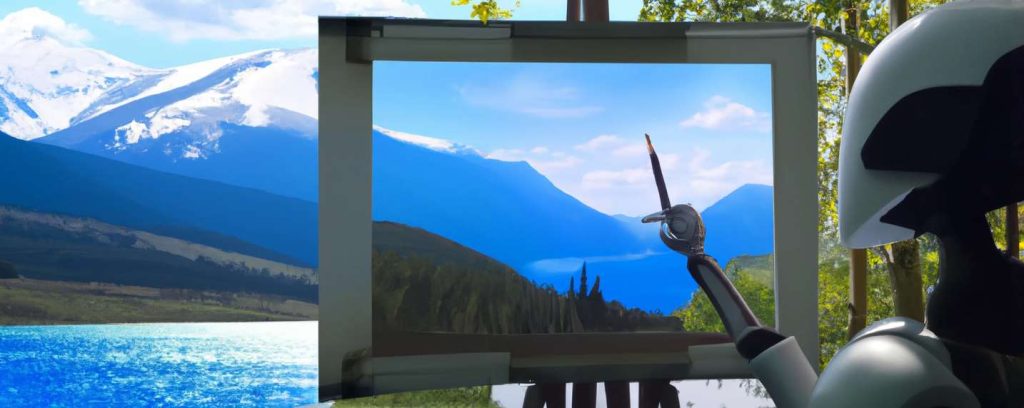 L’idée est simple, vous décrivez l’image avec vos propres mots en spécifiant un style graphique (art numérique, photo réaliste, 3D, peinture à huile, à la façon d’un peintre connu…) et l’intelligence artificielle crée une œuvre de toute pièce pour vous. Ainsi l’image d’introduction de l’article a été générée par Dall-E en lui demandant de générer une image d’un chatbot peignant un paysage.
