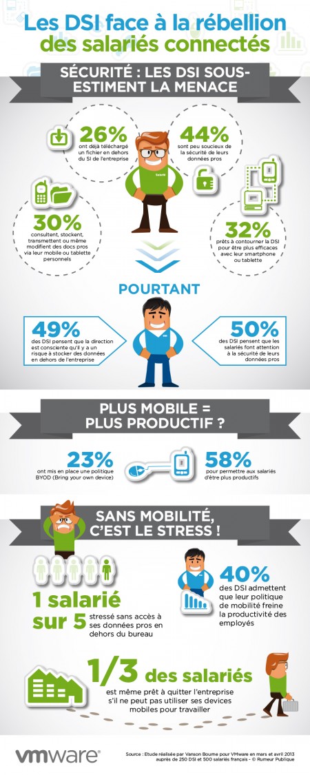 C’est ce que révèle une étude commanditée par VMWare et réalisée par le cabinet Vanson Bourne (1). En France, près de deux salariés des salariés (62 %) estiment que leur entreprise ne leur procure pas les outils et applications mobiles dont ils souhaiteraient disposer ou considèrent que les règles d’utilisation des appareils mobiles ne sont pas assez flexibles pour être propices à un travail nomade efficace (64 %). Plus d’un tiers (37%) des employés disent qu’ils envisageraient de quitter leur entreprise s’ils n’ont pas la permission d’utiliser leur appareil mobile pour travailler.