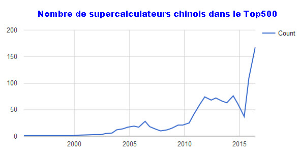 Cela fait déjà quelques années que la Chine a lancé une politique de développement de puissance informatique pour le calcul scientifique et technique. Publiée tous les 6 mois, cette liste est réalisée par les universités de Berkeley (Californie), Knoxville (Tennessee) et de Frankfort (Allemagne). Mais cette 47e édition marque un tournant important. Mais pour la première fois, les Chinois prennent la tête en nombre de calculateurs avec 167 systèmes dans le Top500 devant les Etats-Unis (165) et en puissance cumulée grâce aux deux « monstres » qui prennent les première et deuxième places. L’Europe se place assez loin avec 105 systèmes (26 en Allemagne, 18 en France et 12 au Royaume-Uni).