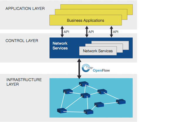 La troisième composante du réseau est l’interface de programmation du système d’exploitation de réseau, ce qui rend en fait la programmation de réseau, d’où l’expression du réseau « défini par logiciel ». Avec la séparation de transmission et de contrôle, mais sans OpenFlow, il faudrait trouver un autre moyen de transport des tables de transferts pour les commutateurs OpenFlow qui est la norme pour notre industrie dont le but reste extrêmement général.