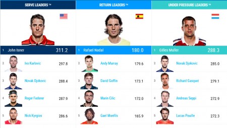 Ainsi et à titre d’exemple, sur les 52 dernières semaines et en surface de jeu sur l’herbe, le français Nicolas Mahut arrive en tête du classement en jeu sous pression, suivi d’Andy Murray et de Roger Federer (qui a déclaré forfait pour l’édition 2016). Sur la même surface de jeu, cette fois-ci en service, c’est le croate Ivo Karlovic qui arrive en tête, suivi de Jo-Wilfried Tsonga et de John Isner.