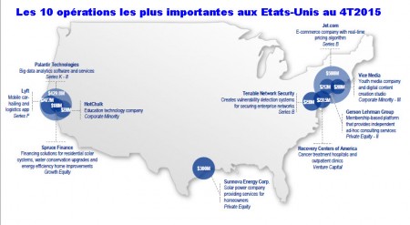 Au cours des trois premiers trimestres 2015, les mega-deals, ceux qui dépassent la barre symbolique des 100 M$, augmenté de manière significative pour atteindre le nombre de 72 au cours du trimestre pour un montant de 20 milliards de dollars. Mais les entrées en bourse peu florissantes qui ont suivi ont jeté un coup de froid et fait tomber ce nombre de transactions de plus de 100 M$ a seulement 38 au quatrième trimestre pour un montant de 11,7 milliards de dollars. Ce coup de froid concerne les trois régions : Etats-Unis, Asie et Europe.
