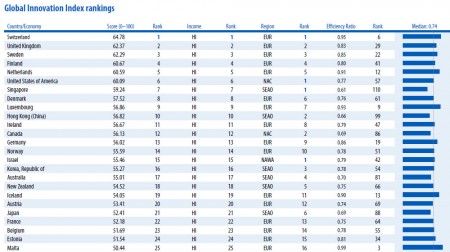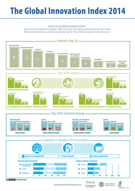 Au Global Innovation Index 2014, la France se classe au 22e rang mondial, en recul de 2 places par rapport au précédent classement.Suisse, Royaume-Uni et Suède, tel est le trio de tête de ce palmarès 2014 réalisé par la World Intellectual Property Organisation, la Business School française INSEAD et l’Université de Cornell dans le Massachusetts. Ce classement est établi à partir de multiples critères, d’un côté les efforts mis en œuvre pour favoriser l’innovation (éducation, infrastructure, services publics en ligne…) et les résultats ((publications universitaires, créations de produits et services, créations sur Internet…).