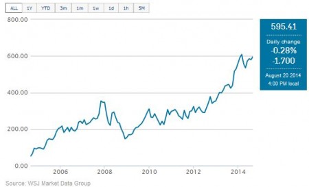 L’action Google a augmenté de 1294 % depuis le 19 août 2004, date de son introduction au Nasdaq, la bourse des valeurs technologiques. Si vous aviez investi 1000 dollars en achetant des actions Google à cette date-là, vous seriez à la tête d’un pactole de 13 945 dollars aujourd’hui. Cela correspond à une augmentation annuelle légèrement supérieure à 30 % à comparer aux 6,1 % du S&P500. Dix entreprises seulement ont fait mieux. La première d’entre elles est la société Keurig Green Moutain dont l’action est passée de 1,47 dollar en 2004 à 115,09 dollars aujourd’hui. Dans le secteur high Tech, Apple a fait mieux avec une croissance de 4 419 % sur cette période et était la seule de ces dix entreprises présente dans le S&P 500 en 2004.