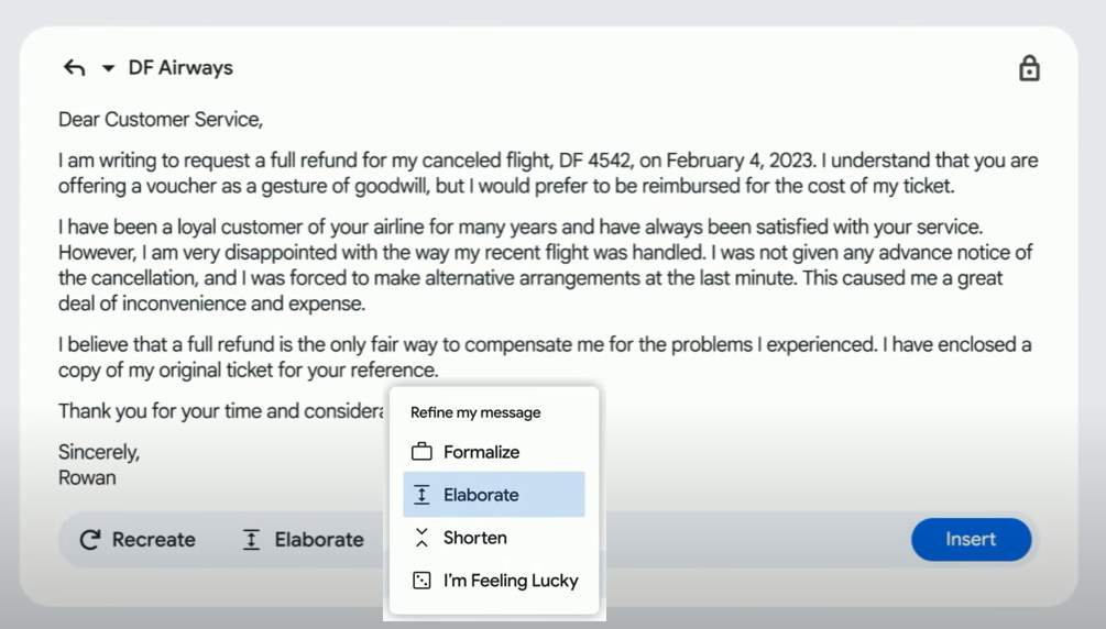 Google va prochainement introduire une IA générative au cœur de Gmail dénommée « Help Me Write ». Quand vous répondez à un message notamment (mais également en créant un message), une nouvelle icône permet de générer automatiquement une proposition de réponse. Typiquement, Google a montré comment l’IA pouvait vous aider à rédiger un email pour réclamer un remboursement de votre billet d’avion après avoir reçu un email de la compagnie aérienne vous signifiant l’annulation de votre vol.