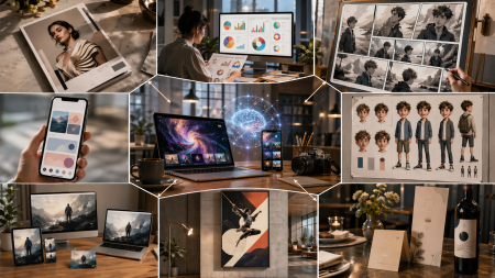 * Produire une planche de BD ou de manga en plusieurs cases avec un même personnage, un même décor et une continuité narrative.