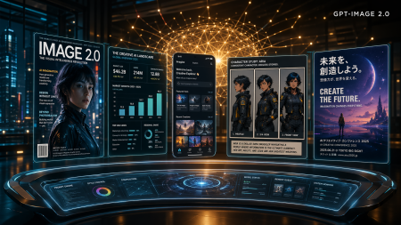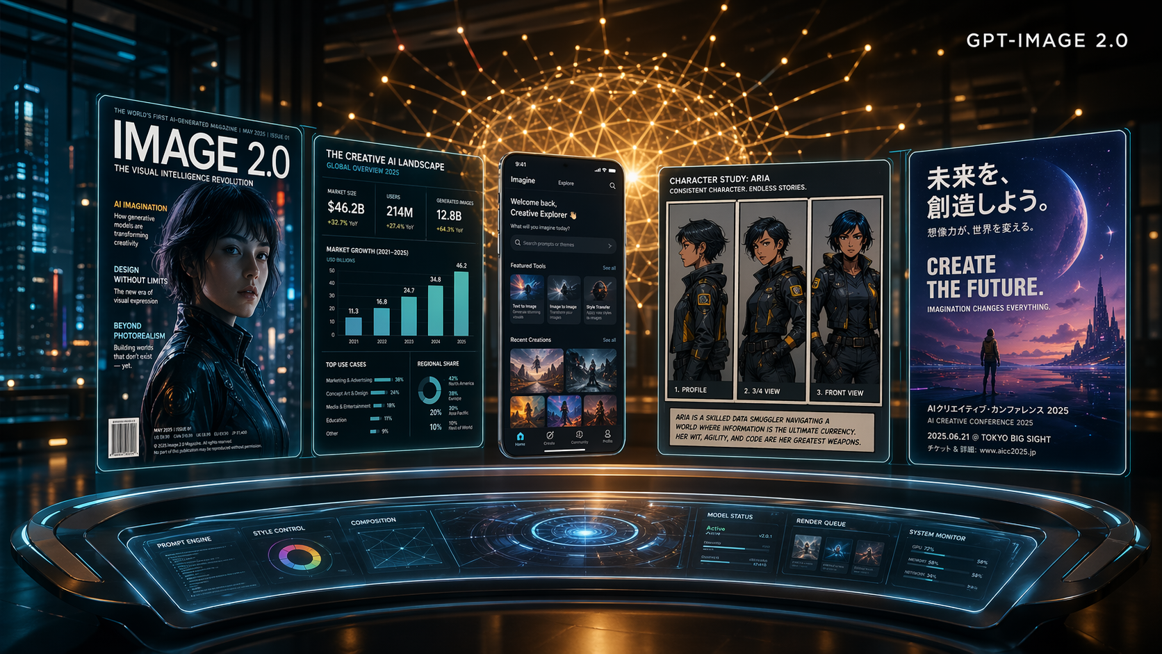 Le prompt : « Plan large cinématographique 16:9 d’un studio créatif numérique futuriste en pleine nuit, éclairage volumétrique spectaculaire en teintes bleu-sarcelle profond et ambre chaud. Au premier plan, une station de travail holographique incurvée et épurée affiche une constellation de panneaux de sortie en lévitation : une couverture de magazine nette avec un titre lisible « IMAGE 2.0 » et des mentions légales en petits caractères, une infographie aux données chiffrées précises et aux graphiques en barres, une maquette d’interface mobile au texte parfaitement lisible, une planche de bande dessinée montrant un même personnage dans trois poses cohérentes, et une affiche bilingue (caractères latins et japonais). Tous les panneaux sont d’une netteté absolue, parfaitement alignés, avec une typographie impeccable. En arrière-plan, une structure subtile de réseau neuronal doré rayonne vers l’extérieur, symbolisant le moteur d’IA. Étiquette minimaliste flottante « GPT-IMAGE 2.0 » en sans-serif épuré dans le coin supérieur droit. Esthétique photographique éditoriale haut de gamme, rappelant les couvertures de Wired ou de MIT Technology Review, profondeur de champ, reflets chromatiques subtils sur les surfaces vitrées, ultra-détaillé, rendu photoréaliste, qualité 2K. »