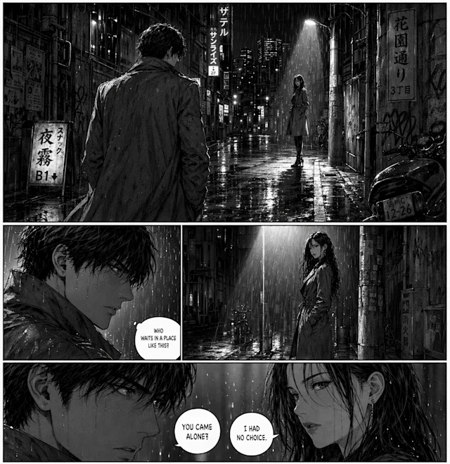 Le prompt : « Planche de bande dessinée dans le style d’un manga japonais seinen : noir et blanc, trames, cases dynamiques, trait réaliste et mature.