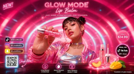 Le prompt : « Publicité pour le lancement d’un baume à lèvres effet glow par une célébrité mode, ciblant les 14-30 ans. Ambiance shooting professionnel, mannequin cool, tendance et stylé·e. Esthétique épurée, rendu premium et luxueux, visuel résolument dans l’air du temps. »