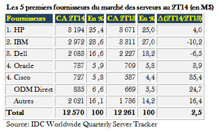 Sur les serveurs x86, HP domine encore un peu plus avec près de 30 % du marché. Mais c’est là un niveau un peu inférieur à celui que détenait HP en 2001 au moment du rachat de Compaq qu’IDC évaluait à 35 % pour l’attelage texano-californien. Dans les grands mouvements depuis cette époque, il y a eu l’arrivée de Dell qui voulait sortir étendre sa zone d’influence au-delà des PC, l’effondrement de Sun, devenu Oracle depuis et l’émergence d’un nouveau venu, Cisco, qui a désormais sa place dans le Top 5. C’est en 2009 que la firme de John Chambers a fait une entrée remarquée sur les serveurs en introduisant son architecture Unified Computing System (UCS) qui présentait une nouvelle plate-forme convergée et destinée principalement à peupler les data centers. Cisco fait jeu égal avec Oracle qu’il devrait dépasser rapidement si l’on en juge par leur taux de croissance respectifs du deuxième trimestre 2014 : 35 % pour le premier et 4 % pour le second.