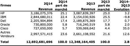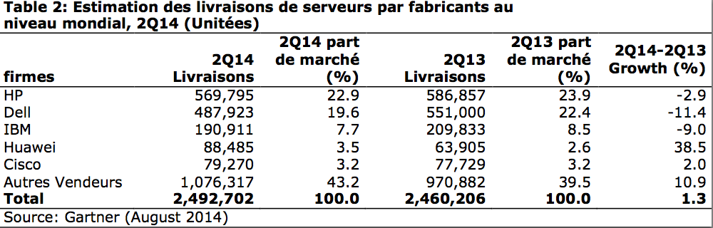 D’un point de vue général, selon le bureau d’étude Gartner, au deuxième trimestre de 2014, les expéditions de serveurs à travers le monde ont augmenté de 1,3% sur les douze derniers mois, tandis que les recettes ont progressé de 2,8 % par rapport au deuxième trimestre de 2013,