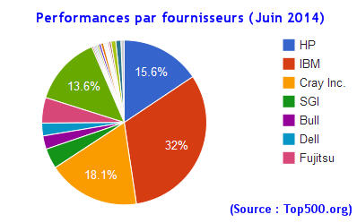 Côté microprocesseur, Intel est le grand gagnant et dispose aujourd’hui d’un quasi monopole en étant présent dans plus de 85 % des systèmes. Les microprocesseurs multi-cœurs sont devenus la norme et plus de 96 % des systèmes du Top500 utilisent des puces dotées de 6 cœurs ou plus. IBM qui nourrissait d’importants espoirs pour ses microprocesseurs Power doit se contenter de la portion congrue en étant présent sur seulement 8 % des machines du classement. Ils sont même largement minoritaires au sein des machines estampillées Big Blue (40 sur 176). A l’heure où IBM réfléchit à la vente de l’activité de fabrication des composants Power, on peut s’interroger sur la pérennité de cette filière. Autre tendance à signaler, l’utilisation plus importante de technologies d’accélération grâce à l’adjonction d’un coprocesseur. Sur les 62 supercalculateurs qui sont dans ce cas, c’est NVIDIA qui vient en tête (44), devant Intel avec son Xeon Phi et ATI Radeon (2).