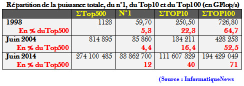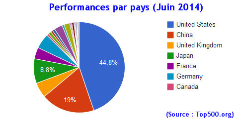 Pour la troisième fois consécutive, le Tianhe-2, supercalculateur développé par la National University of Defense Technology, détient la première place du Top500 avec près de 34 Pflops deux fois plus puissant que le Titan, la machine du DOE/SC/Oak Ridge National Laboratory, et représentant plus de 12 % de la puissance totale cumulé du classement. Dans ce classement de juin 2014, la Chine détient 76 machines dans le Top500, soit plus que l’Angleterre (30), la France (27) et l’Allemagne (23) réunies. Le Japon qui a longtemps été un solide second est désormais loin de son rival asiatique. Il y a seulement 10 ans, la Chine n’avait que 14 systèmes et l’ordinateur chinois le plus puissant de l’époque n’était qu’à la dixième place. En pourcentage de la puissance cumulée, la Chine est passée du néant en 1993 à 19 % en 2014.
