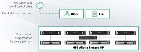Tout démarre avec les baies HPE Alletra Storage MP au cœur de cette nouvelle gamme « GreenLake for File & Block Storage ». Ces baies ont spécialement été pensées pour le scale-out et la montée en charge mais cherche également à briser les silos entre environnements blocs et environnements fichiers afin de retrouver de la simplicité et de la flexibilité. Ces baies reposent sur une approche « désagrégée » avec des nœuds contrôleurs Alletra Storage MP (MP pour Multi Protocol) connectés à des nœuds capacitifs via une fabric NVMe. Nœuds contrôleurs et nœuds capacitifs peuvent monter à l’échelle indépendamment pour privilégier la performance ou la capacité. Une telle approche permet de combiner fiabilité, performances et surtout élasticité en mode ‘scale-out’ tout en proposant aux entreprises une même solution matérielle pour leurs workloads en mode blocs (bases de données, SAN) et en mode fichiers (bureautiques, données non structurées, NAS). Il y a toutefois un bémol. Même si les baies peuvent être utilisées aussi bien pour du bloc que du fichier, deux environnements logiciels séparés demeurent apparemment nécessaires, il ne s’agit donc pas directement d’un vrai stockage unifié.