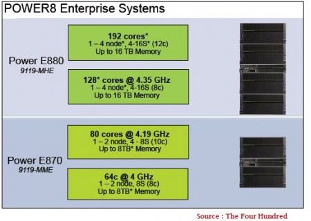 A la sortie de cette nouvelle génération de serveurs, seuls les serveurs E870 et E880 à un ou deux nœuds et utilisant des processeurs à 8 cœurs sont disponibles portant le maximum de cœurs par serveurs à respectivement 64 et 80 cœurs. Les configurations plus étoffées seront annoncés dans le courant 2015 (128 cœurs pour l’E870 et 192 pour l’E880).