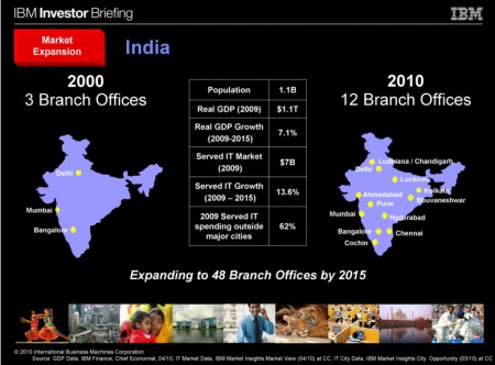 Au 31 décembre 2013, IBM employait 431 212 salariés contre 434 246 un an plus tôt. C’est ce qu’indique le rapport annuel 2013 (What will we make of this moment?). Depuis 2009, IBM ne donne plus aucune informations sur la ventilation de ses chiffres et pour cause car ils sont plutôt délicats à commenter. Selon les dernières estimations IBM emploierait un peu plus de 70 000 salariées aux Etats-Unis contre 153 000 en 2000. A cette époque, la filiale indienne ne représentait que quelques centaines de personnes. Aujourd’hui, elle est la première force de Big Blue avec quelque 150 000 salariés (Amid Global Push, IBM Has Shrunk Its U.S. Workforce By Half Since 2000) contre 50 000 il y a une dizaine d’années (IBM Eyes 50,000-Plus Indian Employees). Ce transfert est la simple résultante du plan stratégique Roadmap 2015 lancé par Sam Palmisano, le prédécesseur de Ginni Rometty, qui avait donné comme alpha et omega de l’entreprise d’atteindre un bénéfice de 20 dollars par action en 2015 (IBM arrive-t-il au bout de son modèle ?). Pour l’atteindre, IBM s’échine à réduire les coûts, notamment salariaux. D’où ce principe des vases communiquants salariaux entre les filiales américaines et indiennes.