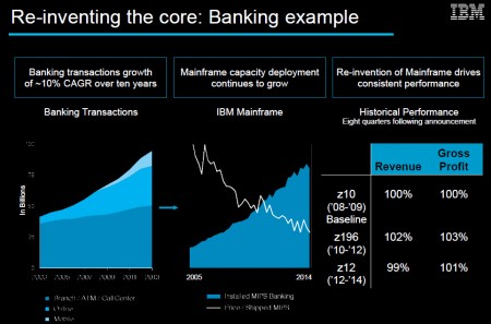 Pour la seconde, IBM vient de dévoiler le z13, la dernière génération de ses mainframes dont le premier système a été livré il y a quelques jours et qu’IBM sous le signe de la révolution mobile. Le z13 a beau être le successeur d’un système lancé il y a un demi-siècle, il concentre nombre de technologies que les serveurs x86 ont découvert il n’y a pas si longtemps à commencer par la virtualisation (un système z13 peut héberger jusqu’à 8000 machines virtuelles). Mais il y a aussi la haute disponibilité, le support de Linux et de Java, de l’analytics notamment avec hadoop et d’une base de données in-memory. Même s’il représente désormais une part relativement faible du chiffre d’affaires d’IBM, le z13 est générateur de revenus en logiciels et services importants et dont les premiers effets devraient se faire sentir à partir du second trimestre 2015. Les mainframes IBM sont très présents dans certains secteurs à commencer par la banque – dans 92 de 100 plus grandes mondiales -, l’assurance (10 sur 10), la grande distribution et les compagnies aériennes. Ce serveur a été conçu de telle manière qu’il peut supporter à la fois du transactionnel et de l’analytics, ce qui rappelle IBM n’est pas conseillé. En tant que dinosaures de l’informatique, les mainframes sont-ils en train de disparaître ? 80 % des données des grandes entreprises résident dans les mainframes qui assurent 30 milliards de transactions par jour. Deux chiffres qui constituent pour IBM une réponse à la question.