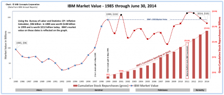 Mais ce qui pourrait être présenté comme un incident de parcours semble en fait s’inscrire dans un lent processus de dégradation tant en interne qu’en externe. Delon la formule de l’investisseur Peter Greulich[1] de MBI Concepts (The Investment Contest Of The Century: Warren Buffett And The Stock Market Go Toe-To-Toe Over IBM): « les collaborateurs sont démotivés et IBM le sait, les clients sont fatigués des luttes politiques internes qui détruisent les forces de vente, des coûts de maintenance et d’intégration pour la mise à niveau des logiciels de middleware, quant aux investisseurs ils sont devenus hésitants (…) Si Warren Buffet émet le moindre doute demain dans une interview, la valeur de son portefeuille diminuera. S’il annonce un nouveau rachat, il augmentera ». Il faut rappeler que Warren Buffet est depuis novembre 2011 l’investisseur le plus important d’IBM avec un peu plus de 7 %.