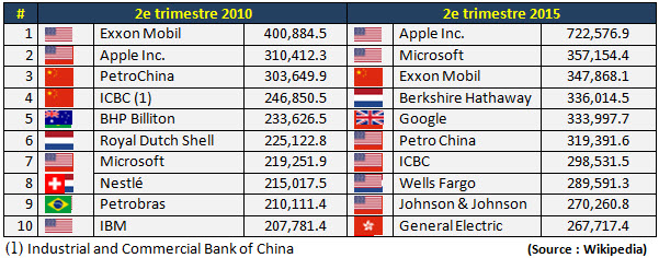 Au troisième trimestre, Amazon et Facebook devraient y ont fait leur entrée. Dans un mouvement inverse, IBM qui était encore présent dans ce top10 en est bien sorti et ne devrait y revenir de sitôt. En 5 ans seulement, on observe une évolution spectaculaire : en 2010, 4 sociétés pétrolières étaient présentes dans ce top10 avec Exxon comme porte-drapeau, une seule en 2015. Il est vrai que la baisse du prix du pétrole a accéléré ce mouvement. En revanche, les sociétés technologies y renforcent leur présence avec Apple qui écrase tout sur son passage avec une capitalisation double du numéro.