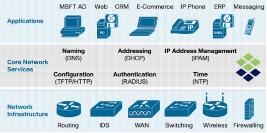 Pour ceux qui ne connaitraient pas le DDI, celui-ci rassemble en fait principalement trois types de services pour serveurs critiques. Ils sont souvent les cibles de la plupart des virus et autres malwares, car lorsqu’on prend possession de ses services on peut souvent avoir accès à tous les serveurs d’une entreprise. Pour le bon accès aux applications du web, les serveurs DNS (Domain name services), comme leur nom le laisse supposer, fournissent l’association entre les noms d’hôtes et les adresses IP. Ils maintiennent les échanges de trafic http, celui du trafic Web et celui du réseau local. De son coté, le service DHCP ( direct host configuration protocol) attribue des adresses de manière dynamique et offre la  capacité de reconfiguration pour les nœuds qui se connecteraient au réseau.cisco_diagram