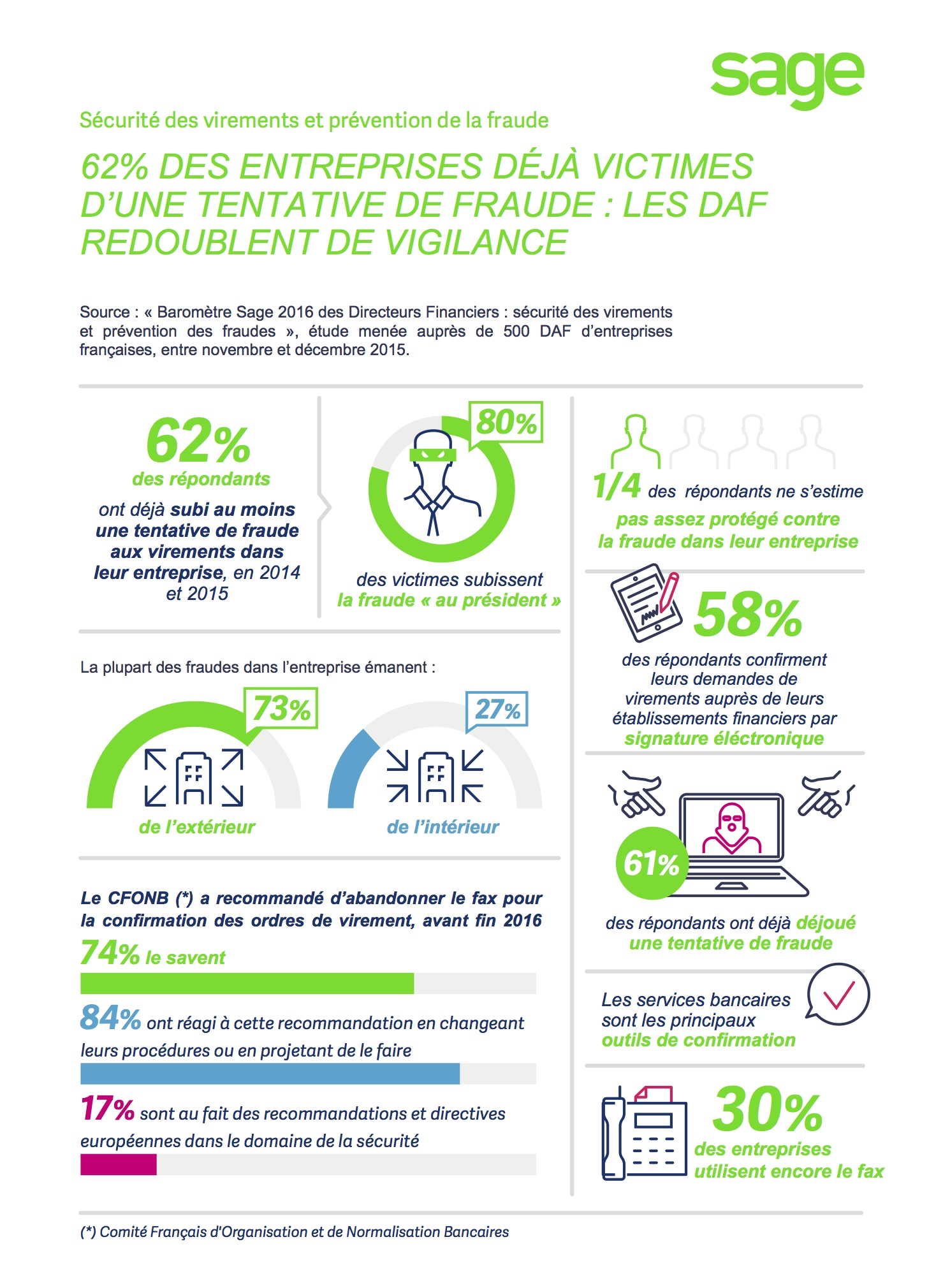 62% des entreprises déjà victimes d’une fraude : c’est le chiffre dévoilé par l’éditeur de logiciels de gestion Sage dévoilait dans son « Baromètre Sage 2016 des Directeurs Financiers : sécurité des virements et prévention des fraudes ». Ci-dessous une infographie qui synthétise les résultats de baromètre.