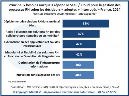 – Près d’un décideur sur deux voit dans le mode SaaS / Cloud une réponse aux besoins croissants d’accéder aux solutions RH hors de l’entreprise et en situation de mobilité et de nomadisme. Imposé par l’évolution organisationnelle et souhaité par les collaborateurs et managers eux‐mêmes, ce mode d’utilisation se révèle également un atout pour les RH en recherche continue de performance ;