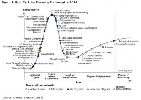 Dans l’édition 2014 de son Hype Cycle for Emerging Technologies qui évalue quelque 2000 technologies, le Gartner en positionne dont certaines sont encore balbutiantes (par exemple le Bioacoustic Sensing ou le Home Connected) et d’autres beaucoup plus avancées (M2M communications services ou le Mobile Monitoring Health. Le Gartner inscrit l’évolution de ces technologies numériques dans 6 phases allant du mode « analogique » au mode « autonome » en passant le Web, l’e-business, le Digital Marketing et le Digital Business. La majorité des technologies décrites sur le graphique du hype cycle évoluent désormais dans les 3 dernières phases définies de la manière suivante :