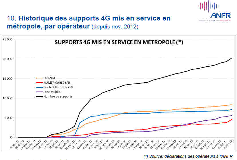 Au 1er janvier 2016, 23 070 sites sont autorisés, dont 20 474 en service, pour la téléphonie mobile très haut débit (4G) tous opérateurs confondus.