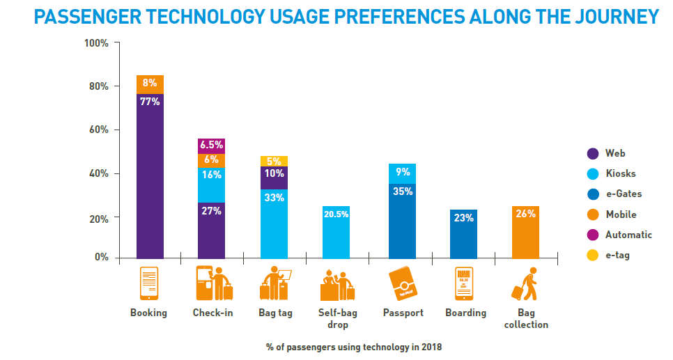 proportion d’enregistrements via le Web (27%). Cependant, l’adoption est considérablement plus faible quand vient à l’utilisation de kiosques libre-service pour l’enregistrement. À l’arrivée, les passagers sont heureux d’obtenir des mises à jour à propos de leurs bagages à leurs mobiles. Plus d’un quart ont utilisé ce service en 2018.
