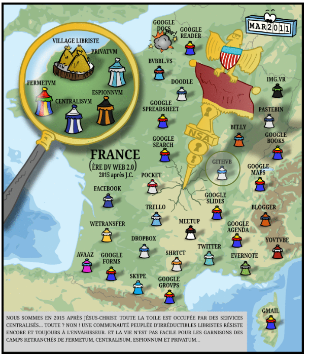 Ci-dessous l’affiche des partisans Français du logiciel » libre » qui s’opposent à l’hégémonie des GAFA et en particulier de Google. Pour eux, c’est la mainmise de Google sur les informations personnelles qui est le plus inquiétant.