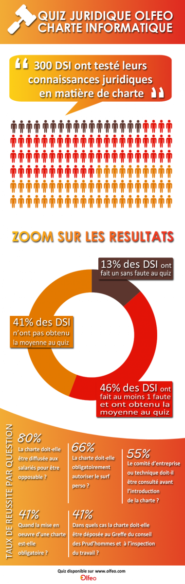 Olfeo a testé les connaissances juridiques des DSI sur la charte informatique. Si la majorité passe le test haut la main, 41 % n’obtiennent pas la moyenne. La charte est pourtant essentielle puisqu’elle permet d’encadrer les risques liés à l’utilisation du système d’information par les salariés et de limiter les responsabilités pénales et civiles de l’entreprise et de ses dirigeants.