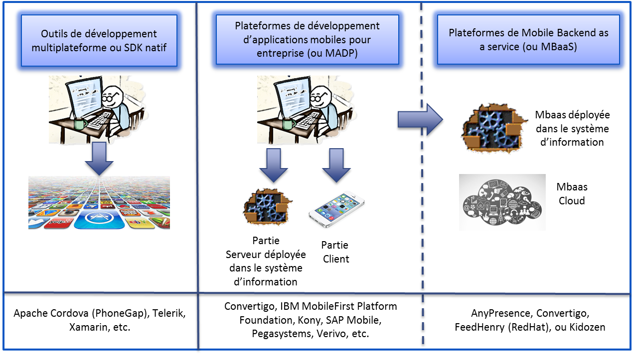 Les MADP se décomposent donc en une partie cliente (l’application mobile) et une partie serveur à installer dans le système d’information (pour réaliser les services d’intégration, de gestion de la sécurité et des droits d’accès, d’accélération des communications, etc.). Les principales solutions de MADP sont Convertigo, IBM MobileFirst Platform Foundation (ex: Worklight), Kony, SAP Mobile (ex: Sybase Unwired Platform), Pegasystems (Ex Antenna) ou Verivo. Notons que parmi ces plateformes, seule Convertigo est open source (ce qui résout le problème du « Vendor Lock in »), avec un modèle de licences payantes pour le déploiement en production.