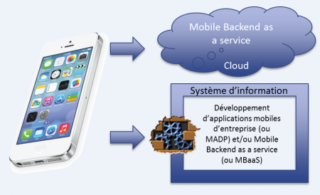 Mais le client en veut toujours plus, et créer une application mobile de nos jours requiert des services additionnels qui n’existent pas dans le système d’information. Les services les plus couramment requis étant les services de notifications (push de données), de synchronisation de données entre l’application et le serveur d’entreprise ou de passerelles d’API transformant les API internes en API optimisées pour les mobiles. D’où l’idée de les offrir à la demande, via un serveur dédié. On parle alors de Mobile Backend as a service (ou MBaaS) que l’on peut séparer en deux grandes familles : les solutions purement cloud et les solutions d’entreprise qui permettent un déploiement local.