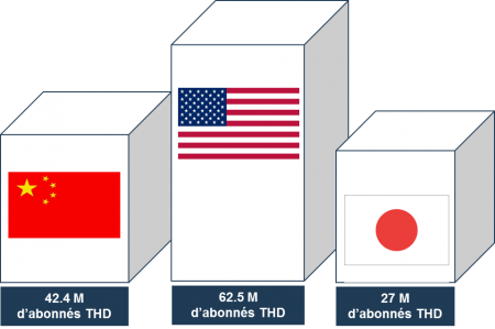 En termes de nombre d’abonnés, et pour l’ensemble des architectures THD, ce sont les Etats-Unis qui arrivent largement en tête avec 62.5 millions d’abonnés fin 2013, contre 42.4 millions pour la Chine et 27 millions pour le Japon. La France, quant à elle, se classe en 7ème position avec un total de plus de 2 millions d’abonnés.