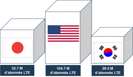 Les Etats-Unis dominent très largement le marché mondial du LTE avec plus de 100 millions d’abonnés, soit 3 fois plus qu’au Japon, deuxième du classement. La France se place en 6ème position par le nombre d’abonnés.