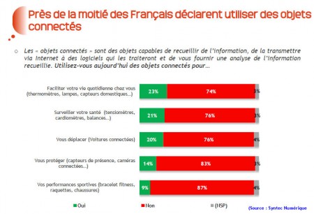Près d’un quart des interrogés déclare aujourd’hui utiliser des objets connectés, en grande partie pour faciliter leur vie de tous les jours (23%). Ils les adoptent également pour surveiller leur santé (21%), se déplacer (20%), ou se protéger (14%). Les objets au service des performances sportives (bracelets fitness, raquette, chaussures..) arrivent quant à eux au bas de l’échelle puisque seulement 9% d’entre eux déclarent en être équipés. C’est ce que révèle une enquête réalisée par BVA pour Syntec Numérique.