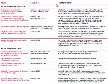 Les actions du plan représentent un potentiel de création ou de consolidation de plus de 100 000 emplois d’ici 2020. Elles invitent les acteurs de notre pays à s’organiser pour que la puissance publique comme les entreprises et les particuliers puissent pleinement tirer profit du cloud dans un contexte approprié de qualité, de protection des données et de sécurité.