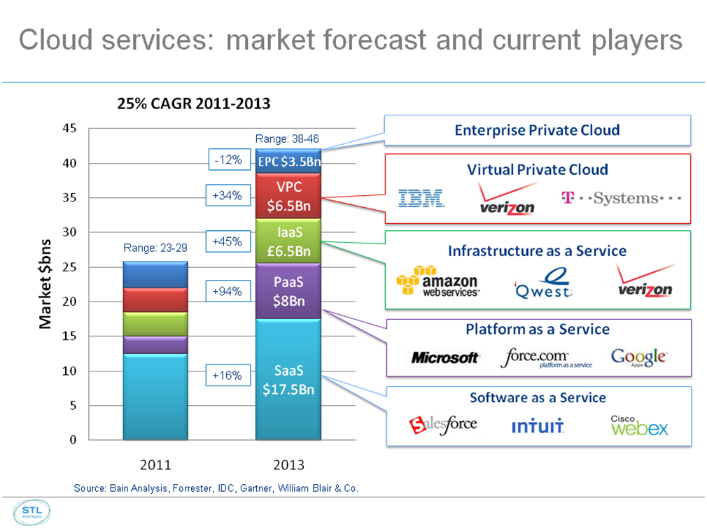Pour Tom Homer le monde informatique, qui était dominé par les fabricants de serveurs (IBM, Sun, HP) au début des années 2000, a vu les entreprises comme Google ou Amazon bouleverser tous les repères. « Nos clients sont désormais partis sur un modèle d’externalisation. Au lieu d’augmenter la puissance de leurs serveurs en permanence, ils ont externalisé leurs besoins. C’est une économie flagrante et les services associés sont plus facilement administrables ». La capacité d’intégrer les nouveaux services pour échapper à une administration complexe, des intégrations difficiles et souvent à des vendeurs inflexibles, ont fait du cloud la solution économique. « Avec le cloud, les opérateurs vendent des services de plus en plus étendus. On ne vend plus des débits, mais de nouveaux services, toujours plus ouverts ». Lors d’une conférence de Bain qui avait consolidé les chiffres d’IDC, de Forrester et du Gartner, il apparaissait que les opérateurs américains historiques Verizon, Quest et T-System faisaient partie des services déjà disponibles (schéma ci-dessous).