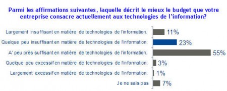 Une PME sur trois considère qu’elle ne consacre pas un budget suffisant à L’IT. Et les raisons ne sont pas toujours liées à des problèmes financiers. Parmi les inquiétudes qui pourraient freiner l’investissement IT, les problèmes de sécurité figurent en bonne place : protection de données, confidentialité et piratage, perte de contrôle des données. Il est vrai que sur ces questions, les PME n’ont pas les mêmes ressources que les grands comptes. Heureusement, elles intéressent moins les cyber-pirates et sont donc moins sujettes à des attaques venant de l’extérieur. Les coûts comme justifications d’un manque d’investissement ne viennent qu’en 5e position.