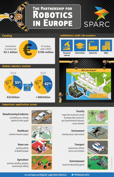 La Commission européenne et le 180 entreprises et institutions de recherche agissant sous l’ombrelle euRoboticsont lancé un programme d’innovation et de recherche dans le domaine de la robotique et couvrant des domaines aussi divers que l’industrie manufacturière, l’agriculture, la santé, le transport, la sécurité. Cette initiative baptisée Sparc est le plus grand programme civil en robotique destiné à renforcer la position du Vieux Continent dans le domaine. Cette initiative est censée créer 240 000 emplois et augmenter la part de marché de l’Europe à 42 %.